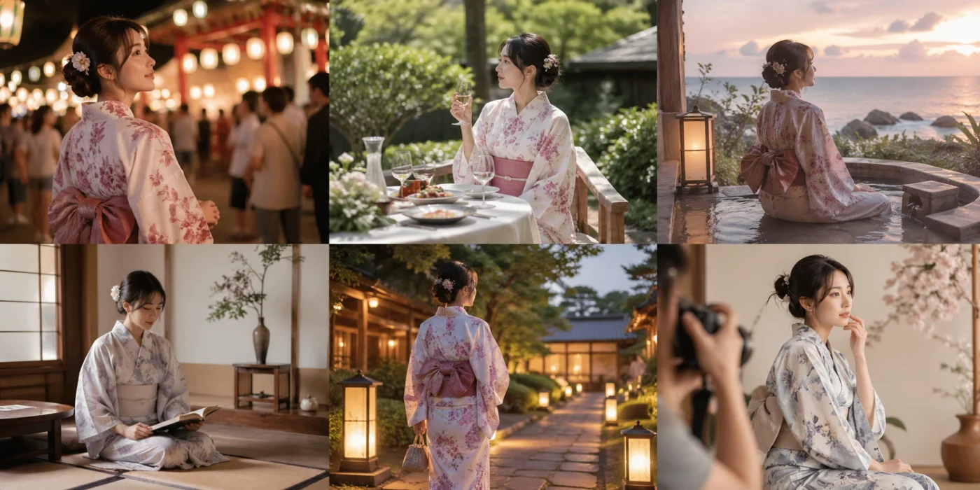 Een van de sterkste punten van de yukata is haar veelzijdigheid. Het is geen kledingstuk dat opgesloten zit in één situatie. Natuurlijk wordt ze klassiek geassocieerd met zomerfestivals, Japanse evenementen en culturele gelegenheden, maar de moderne draagmogelijkheden zijn veel ruimer. Een vrouw kan een yukata dragen op een tuinfeest, tijdens een vakantieverblijf, bij een thematisch diner, voor een stijlvolle fotoshoot, op een wellnessmoment, tijdens een Japanse ceremonie-avond of gewoon thuis als een vorm van bewuste, elegante loungewear.